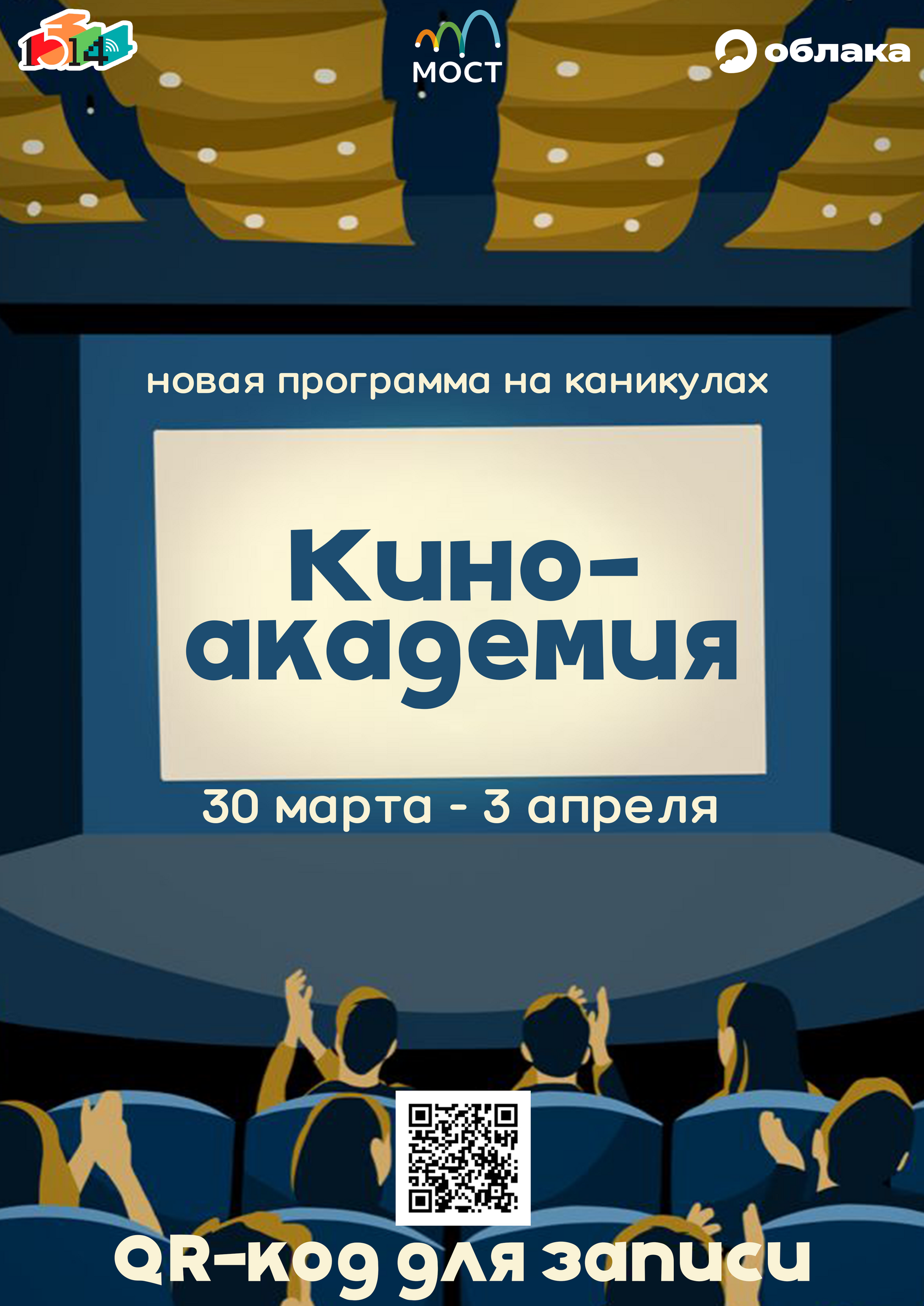 С 30 марта по 3 апреля 2026 года в центре МОСТ (Школа №1514) пройдёт каникулярная программа «Киноакадемия» – увлекательное погружение в мир кино для детей 1–4 классов.